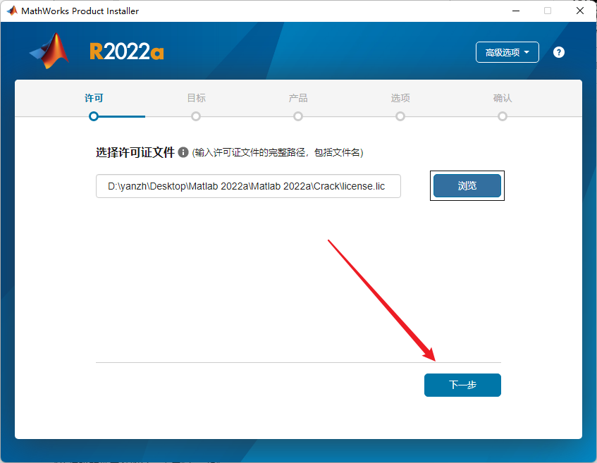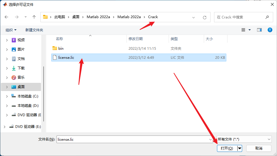 8.在解压后的文件夹Matlab 2022a文件夹中的【Crack】文件夹,选中license.lic文件,点击“打开”