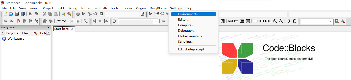 4、打开Code::Blocks,打开CodeBlocks,进入Settings里的Environment。