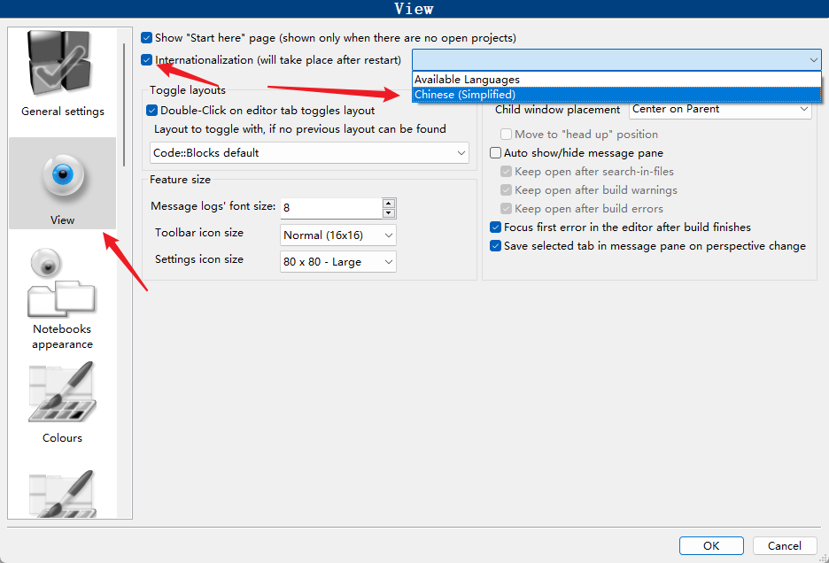 5、点击View,接着打勾Internationalization,选择中文,点击OK。